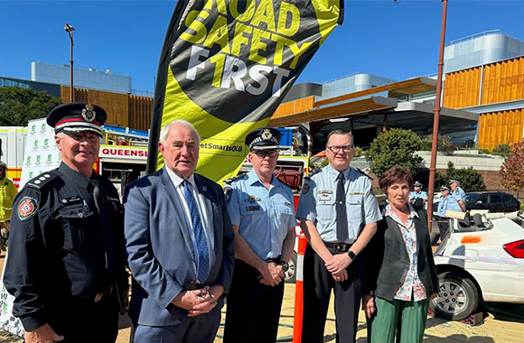 Caption: Queensland Fire and Emergency Services Inspector Hemmo de Vries (left), Toowoomba Region Mayor Paul Antonio, Queensland Police Service Superintendent Douglas McDonald (officer in charge Darling Downs), Queensland Ambulance Service Inspector Stephen Johns and TRC Infrastructure Services Committee chair Cr Carol Taylor stress road safety messages to highlight Fatality Free Friday.