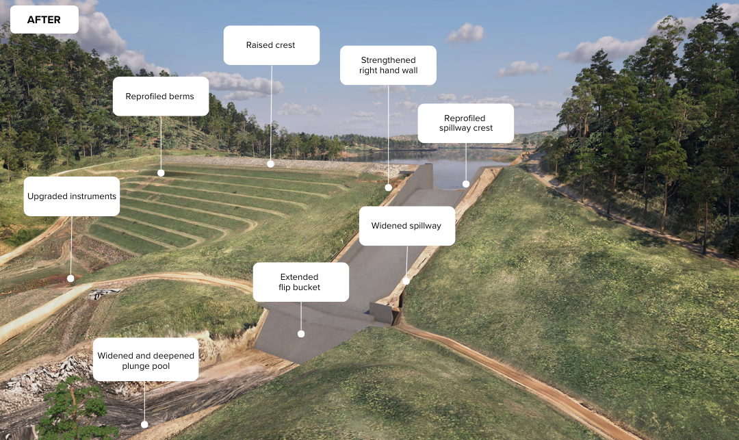 The safety improvements to Cressbrook Dam, including widening the spillway and raising the crest, will ensure the dam can safely pass larger volumes of water in a major flood event. These upgrades are essential to meet modern safety and engineering standards, ensuring the dam can manage future flood risks.