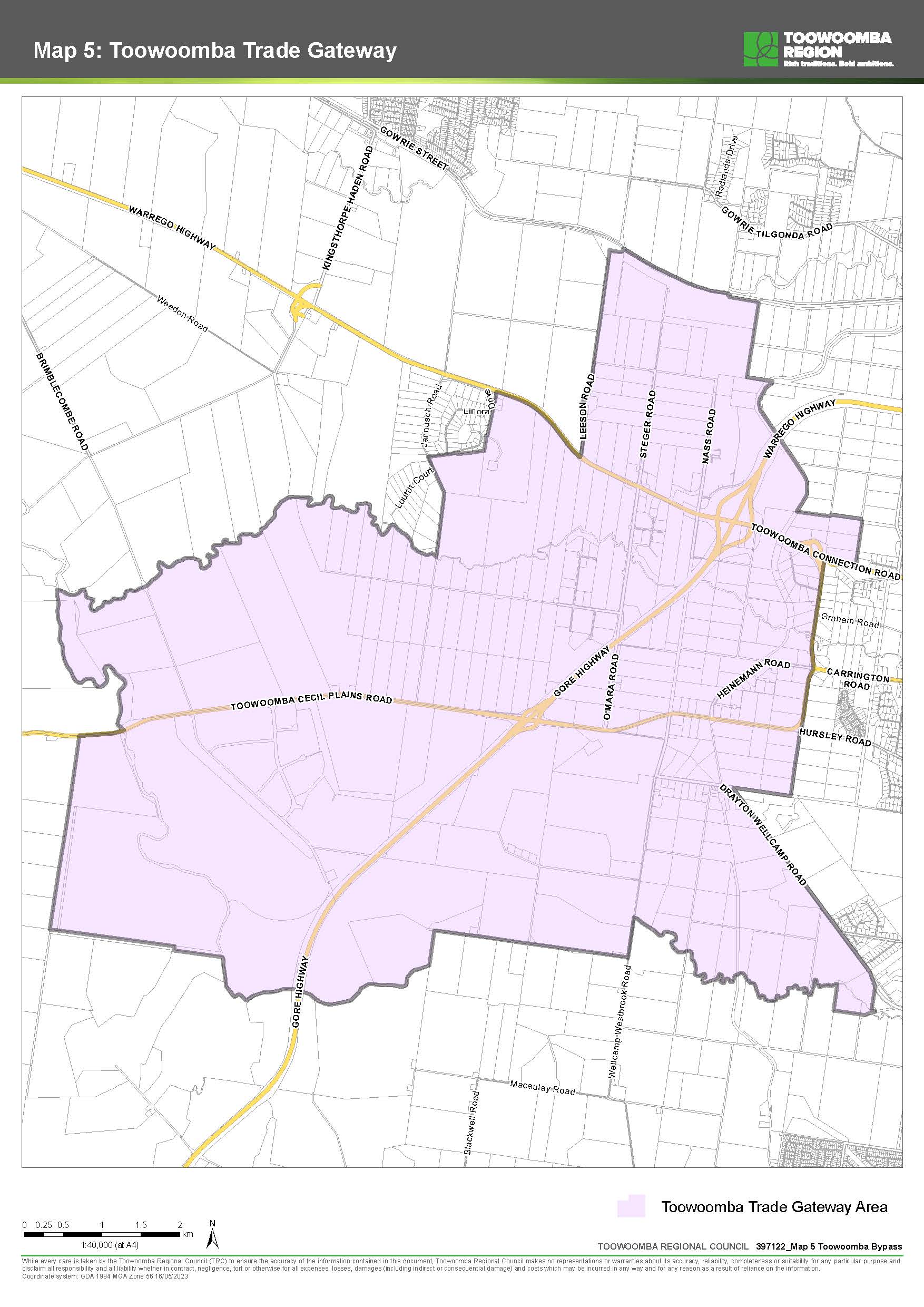 Category: 5.6 - Toowoomba Trade Gateway Extractive (greater than 100,000 tonnes)Description: Land located within the localities identified on map no. 5, used, or capable of being used, for licensed extractive industry purposes, where the quantity of material capable of being extracted is greater than 100,000 tonnes per annum.Identification: Land identified on map no. 5 having the land use code of 40A.