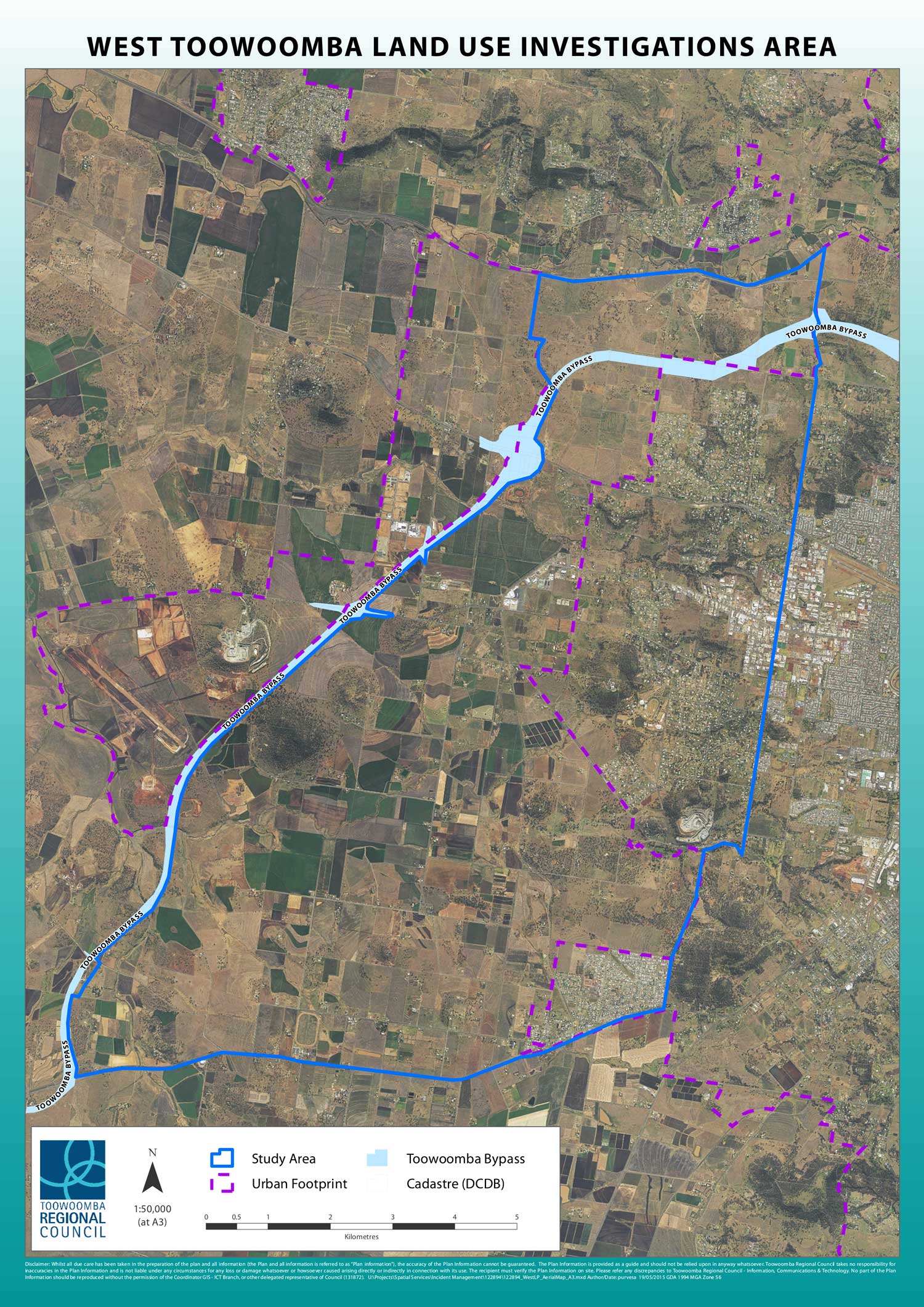 The study area is approximately 9000ha (90km2) and includes Westbrook, Glenvale, Torrington, Cotswold Hills and parts of Charlton and Wellcamp. A map of the study area can be viewed here.