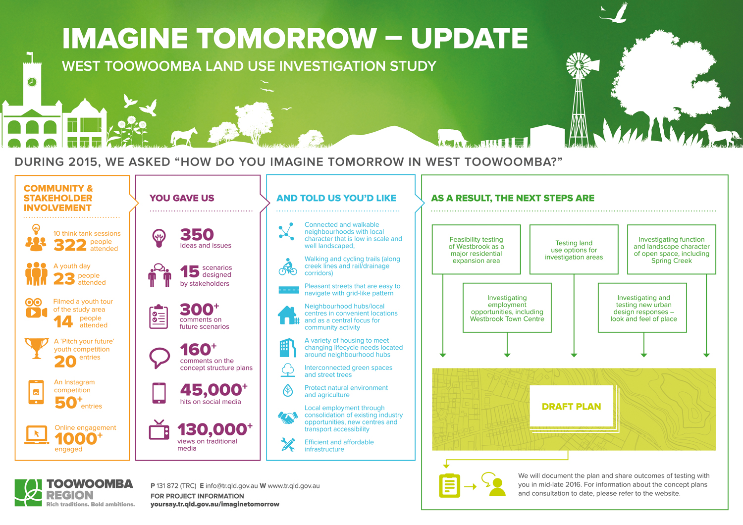 The project involved engaging over 400 community and local stakeholders to develop a shared vision for the future of West Toowoomba. The final plan has been shaped through ideas and feedback generated through this process.