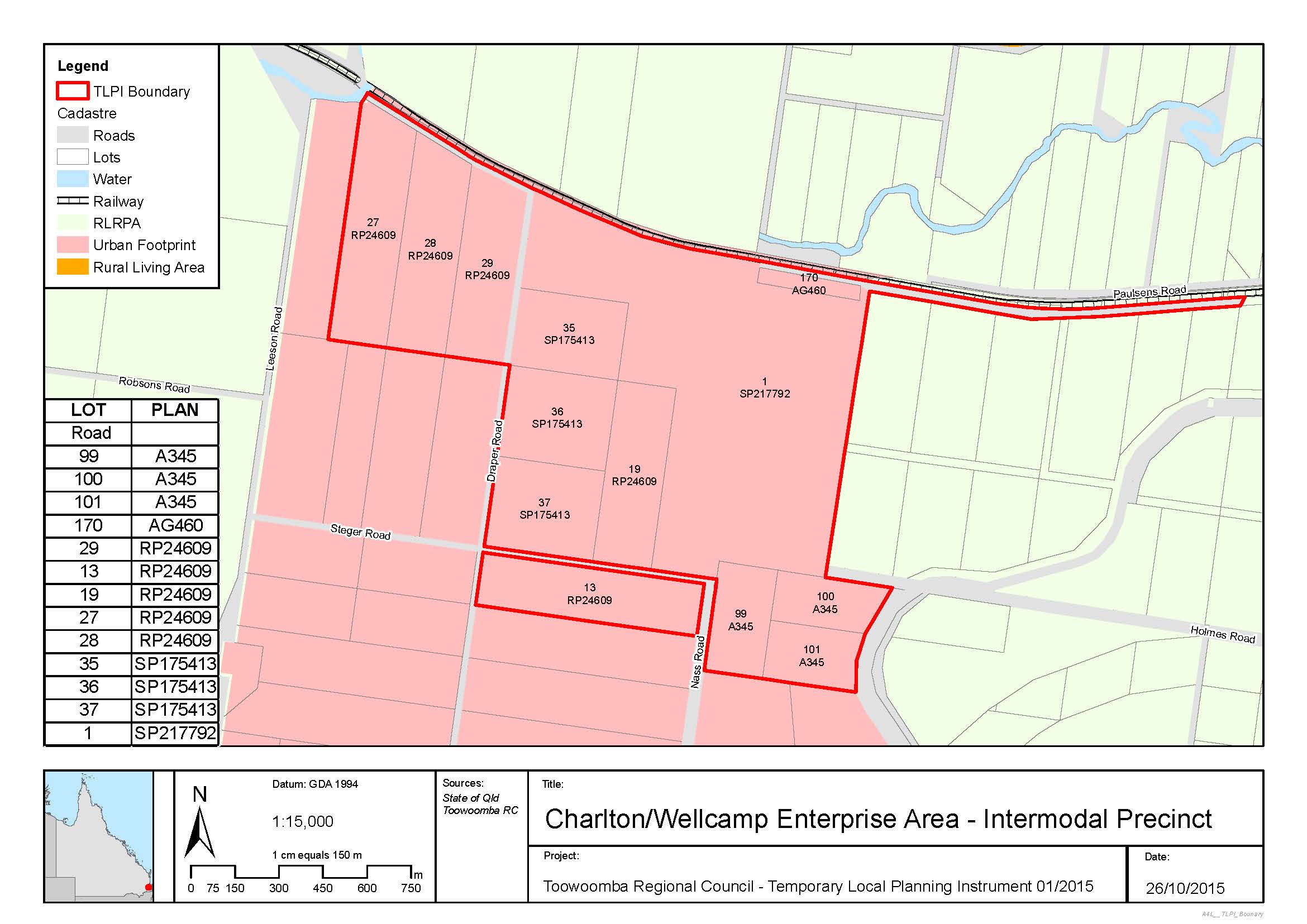 1.1 The purpose of Temporary Local Planning Instrument (TLPI) 01/2015 (Charlton Wellcamp Enterprise Area – Intermodal Precinct) is to ensure that development is subject to consistent development provisions and appropriate levels of assessment that is consistent with the strategic intent of the Toowoomba Regional Planning Scheme 2012.